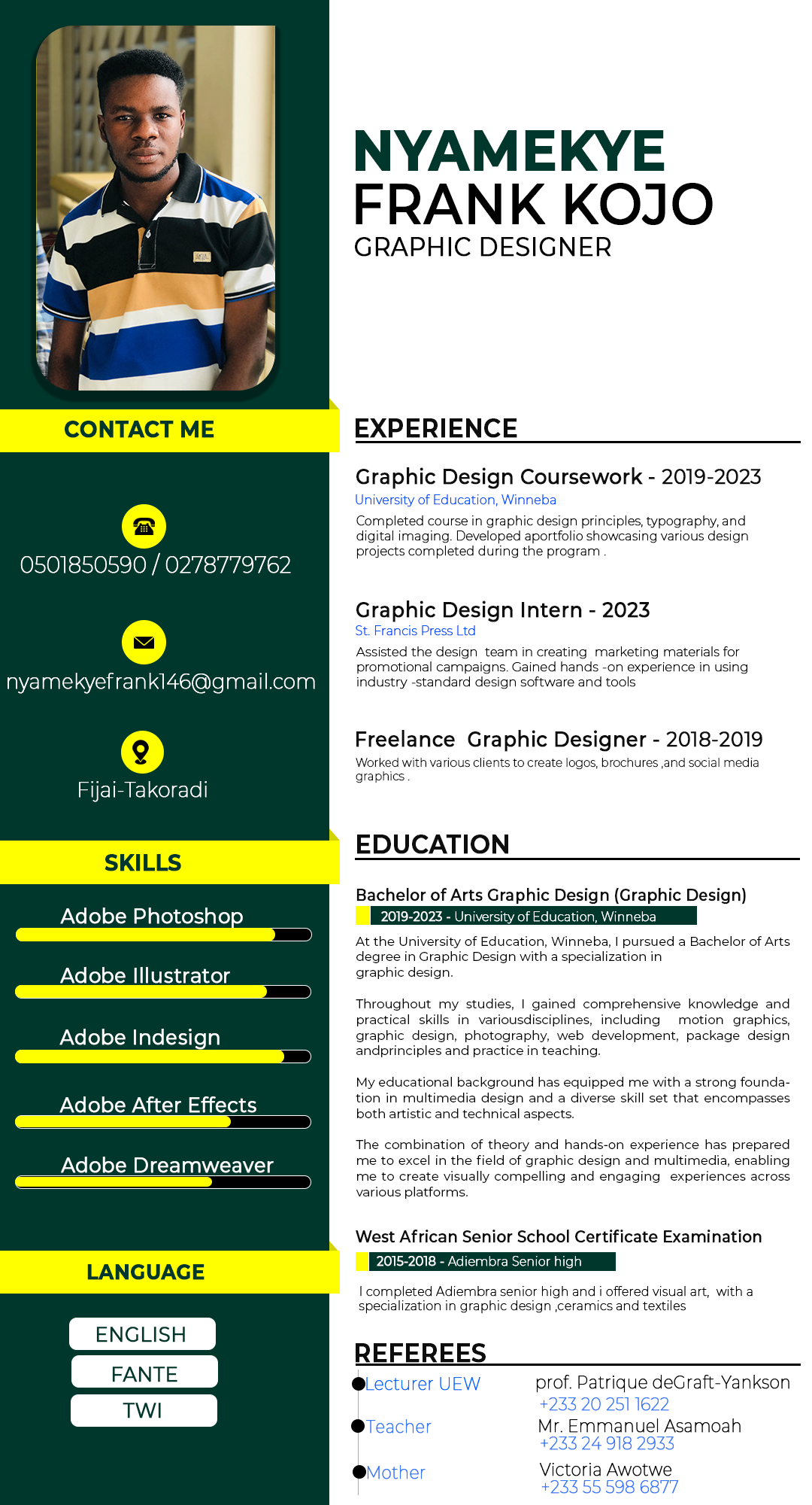 Hello! I'm Frank Kojo Nyamekye,a passionate graphic designer with a love for creativity and storytelling. My journey into the world of design began with a fascination for colors, shapes, and visual communication. As a designer,I believe in the power of visuals to evoke emotions and convey messages effectively. My goal is to craft designs that not only look stunning but also leave a lasting impact on audiences. With a keen eye for aesthetics and attention to detail, I strive for excellence in every project I undertake. I enjoy the challenge of understanding each client's unique vision and transforming their ideas into captivating visuals. Whether it's creating a brand identity, designing a website, or crafting eye-catching print materials, I approach each project with enthusiasm and dedication. Versatility is a key aspect of my design philosophy. I thrive on exploring different styles and techniques, adapting my creativity to suit the demands of diverse projects. From clean and minimalist designs to bold and vibrant concepts, I embrace every opportunity to push the boundaries of design and deliver fresh, innovative solutions. Collaboration is at the heart of my design process. I believe in the value of open communication and working closely with clients to ensure their needs and objectives are met. The joy of seeing clients delighted with the final results is incredibly fulfilling. My passion for design extends beyond the screen. I'm constantly seeking inspiration from various sources, whether it's art, nature, or everyday life. This curiosity fuels my drive to continuously learn and stay updated with the latest design trends and technologies. Join me on this creative journey, and let's collaborate to bring your ideas to life through impactful and memorable designs. I look forward to working together and creating something truly extraordinary!"